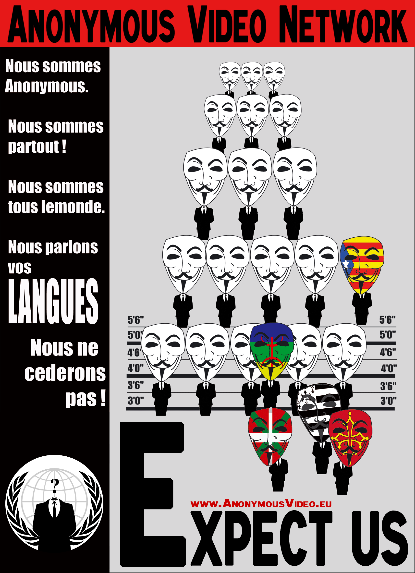 Nous sommes Anonymous. Nous vous demandons de vous joindre à nous. Recherchez-nous et vous nous trouverez. Nous sommes parmi vous. Nous sommes vous. Nous n’avons pas de dirigeants. Uniquement des sensibilités. Nous n’avons pas d’objectifs. Uniquement des résultats. Nous ne pouvons pas être arrêtés, car nous ne sommes qu’une idée.