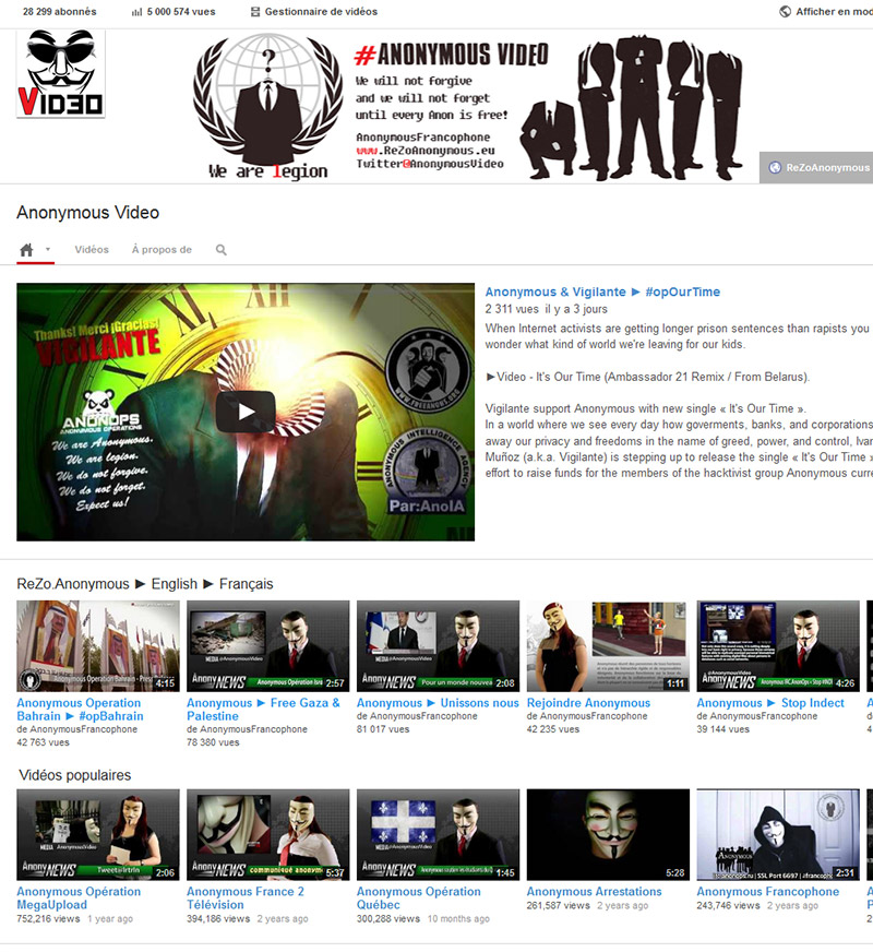 « Youtube a supprimé la chaîne « Anonymous Francophone » créée en janvier 2011. C’était la première chaîne du Collectif en français. Sans préavis, ni explication, toutes les vidéos ont été censurées et supprimées le 18 septembre 2013 (5.300.000 vues / 29.300 abonnés / Voir la capture d’écran ici.)